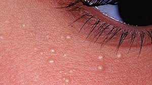 Milia são pontos firmes, em relevo, indolores, brancos e cheios de líquido, entre 1-4 mm de largura que se desenvolvem na superfície da pele.